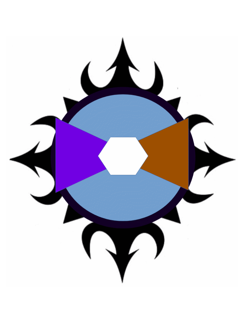 Figure ci-dessus : Le Cercle de la Magie où les pointes extérieures représentent le Chaos, le bleu interne le Vril formé par le Sceau, et les cônes les deux traditions. Au centre l’hexagone des mondes connus.